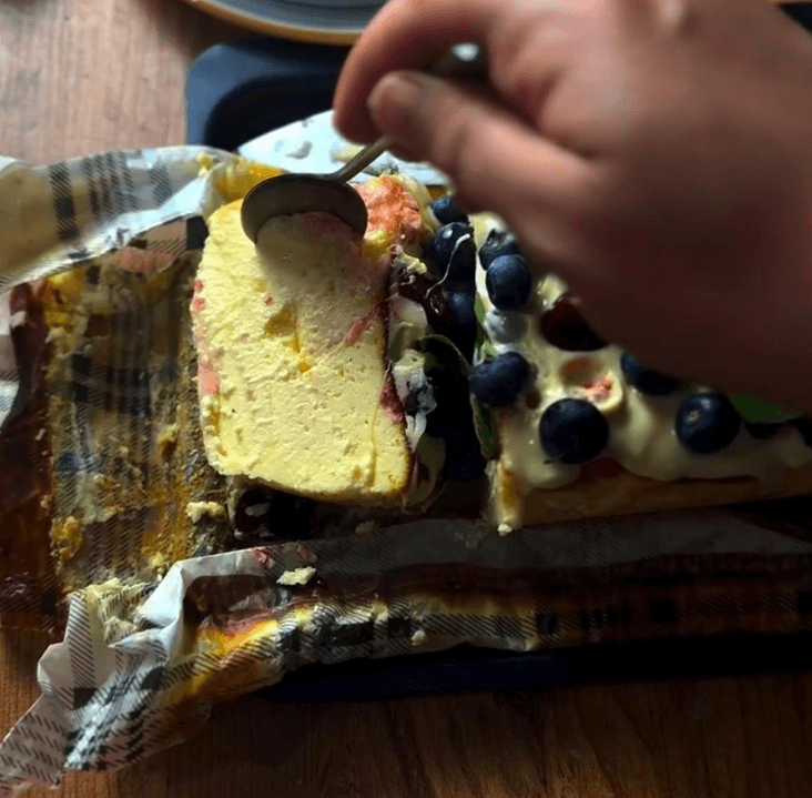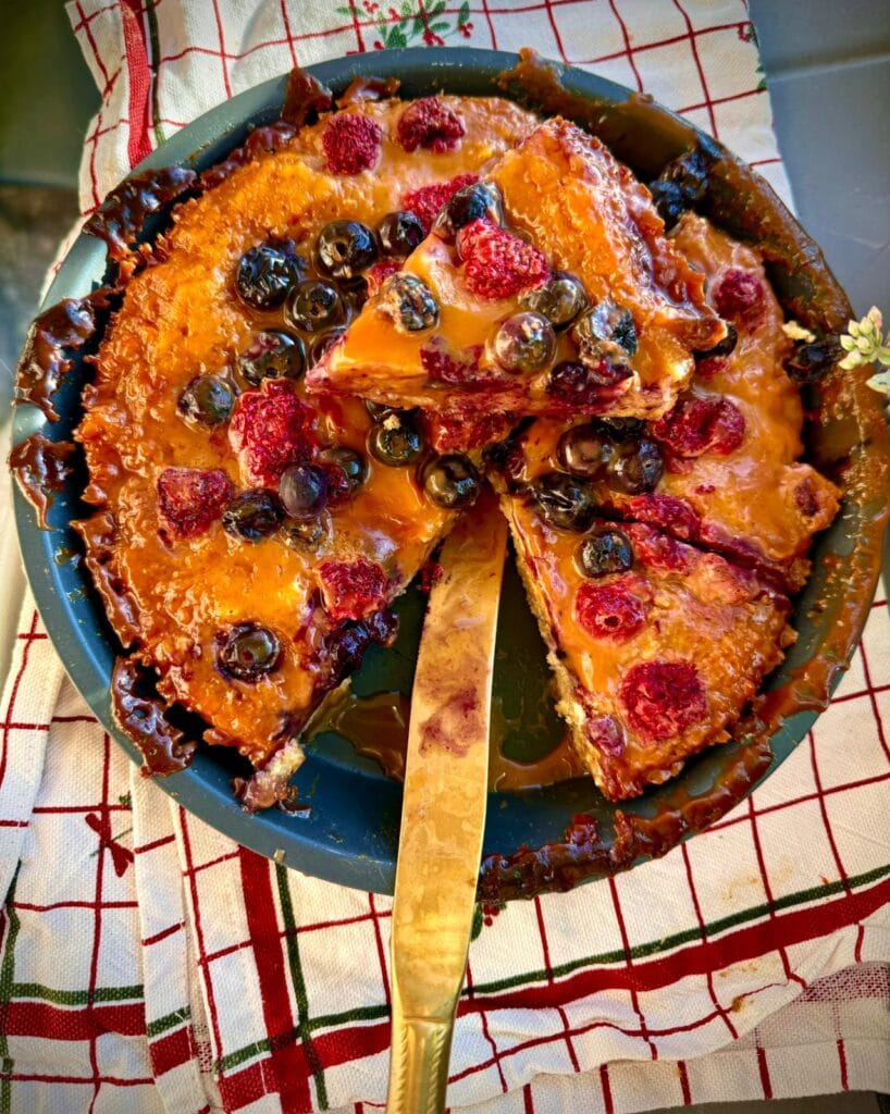 Bu fotoğraftaki tatlı, muhtemelen yabanmersini, ahududu ve süt reçeli gibi zengin ve tatlı bileşenlerle hazırlanmış, peynirli bir taban üzerine inşa edilmiş gibi görünüyor. Renkler ve
