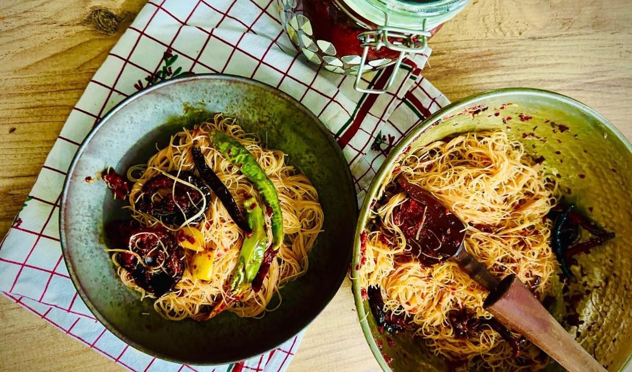 3. Pirinç Çubuklarını Ekleyin: • Haşlanmış pirinç çubuklarını tavaya ekleyin ve dikkatlice karıştırarak baharatlarla harmanlayın.